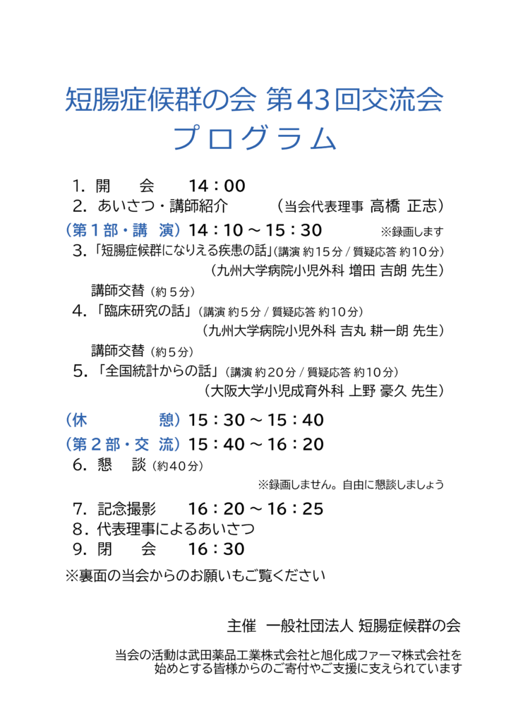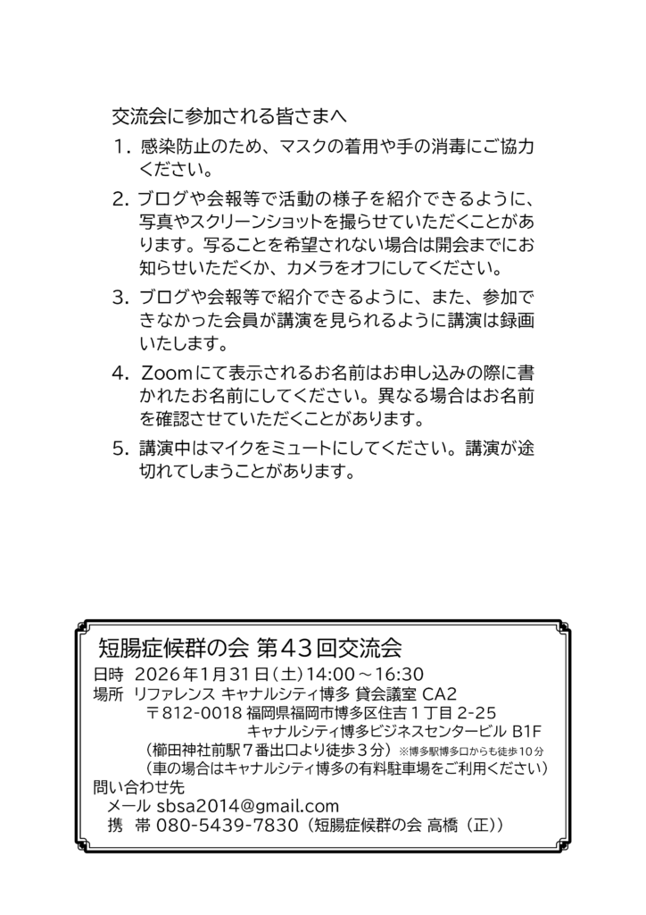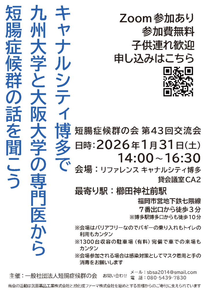 現在位置:ホーム » お知らせ » ✨1/31(土)短腸症候群の会:第43回交流会のお知らせ(福岡市とZoomにて開催)