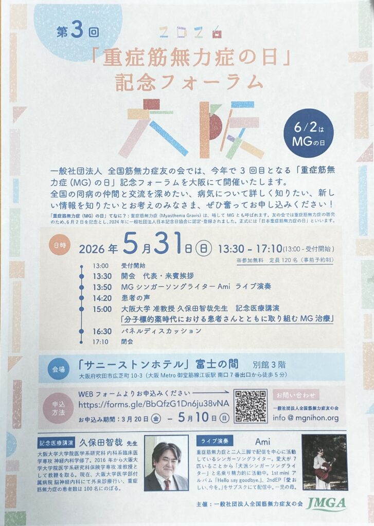 一般社団法人全国重症筋無力症友の会では、今年で3回目となる「重症筋無力症の日」記念フォーラムを大阪にて開催いたします。